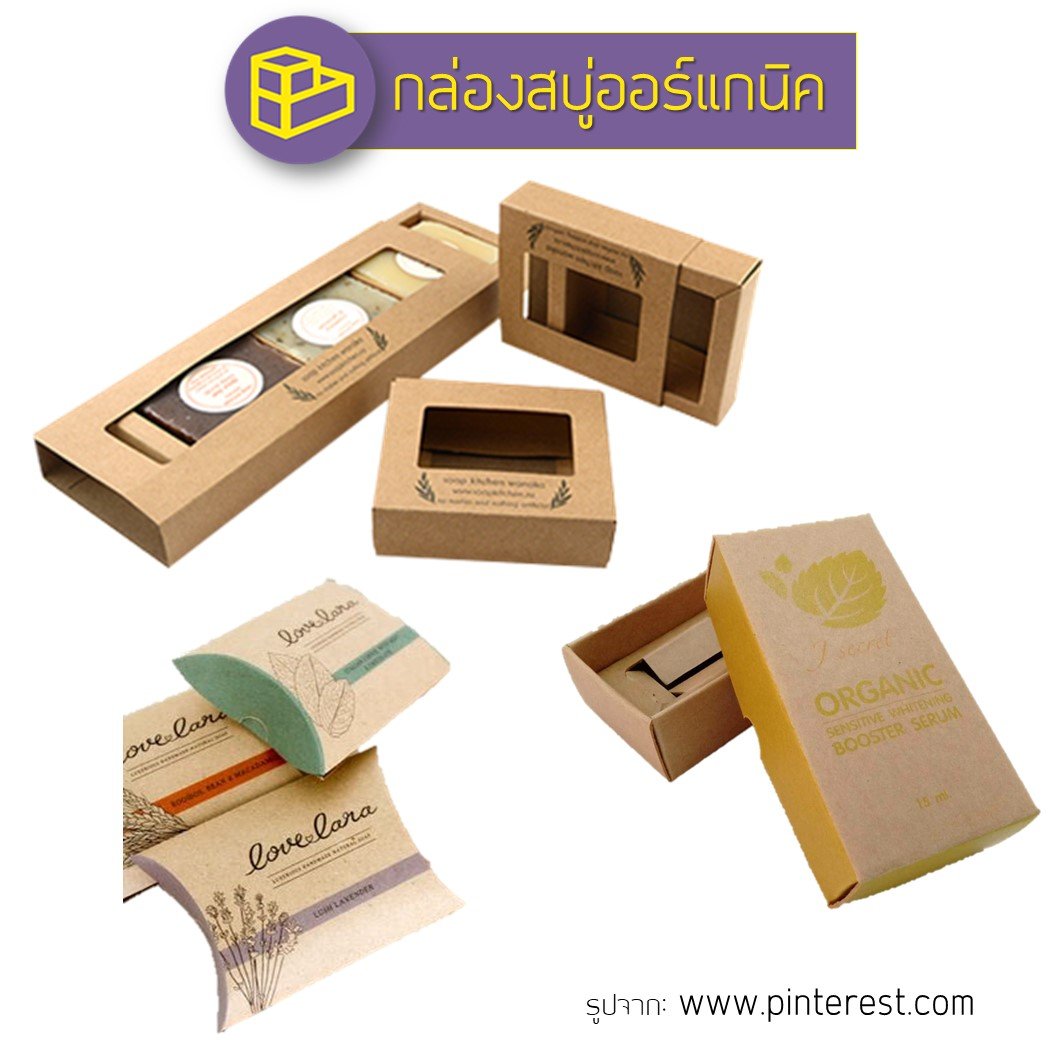 กล่องสบู่ออร์แกนิก เน้นงานสบู่ทำมือ แบบโฮมเมด และคำนึงถึงความปลอดภัยต่อผู้ใช้ เนื่องจากเป็นผลิตภัณฑ์ที่ส่งผลต่อผิวของผู้ใช้โดยตรง ดังนั้น ผลิตภัณฑ์เหล่านี้จะให้ความใส่ใจเรื่องส่วนประกอบที่ไม่เป็นอันตรายต่อผิว นอกจากนี้ภาพลักษณ์ของแพ็คเกจจิ้งก็เป็นสิ่งสำคัญเช่นกัน เมื่อผลิตภัณฑ์เน้นแนวออร์แกนิกแล้ว การออกแบบกล่องก็ต้องสอดคล้องตามกันไปด้วย เช่น การเลือกใช้กล่องกระดาษคราฟท์ พิมพ์ลายกราฟิกน้อยๆ เน้นแนวกล่องธรรมชาติ ทำให้ผลิตภัณฑ์ดูน่าใช้มากขึ้น