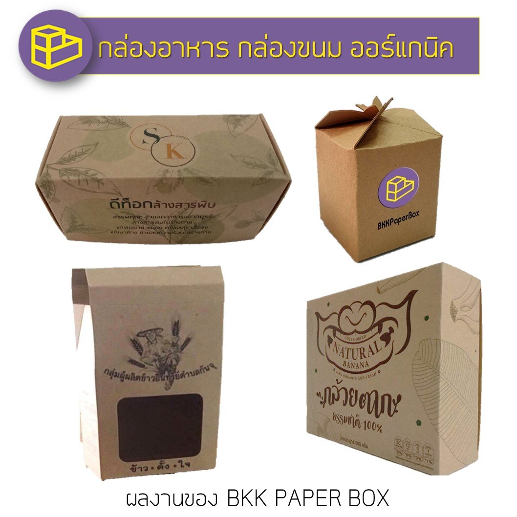 กล่องอาหาร กล่องขนม ออร์แกนิก ผลิตภัณฑ์เกี่ยวกับขนมคลีนหรืออาหาร ออร์แกนิกก็ได้รับความนิยมจากผู้บริโภคที่ต้องการรักษาสุขภาพ ดังนั้น การออกแบบกล่องอาหารเพื่อสุขภาพเหล่านี้ต้องคำนึงถึงความปลอดภัย และเลือกใช้กระดาษที่ให้ความรู้สึกปลอดภัยด้วย เช่น กระดาษคราฟท์ เป็นต้น