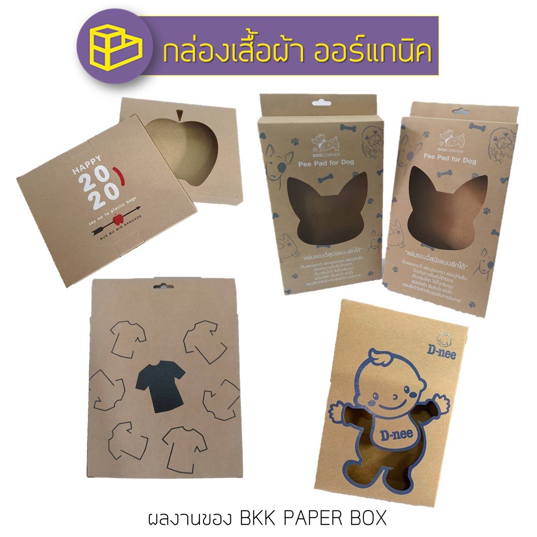 กล่องเสื้อผ้า ออร์แกนิก เช่น เสื้อผ้าเด็ก ผ้าอ้อมเด็ก หรือเสื้อผ้าของผู้ใหญ่ที่ผลิตด้วยเส้นใยธรรมชาติ แบรนด์ที่ต้องการนำเสนอเรื่องความออร์แกนิกในการผลิต สามารถออกแบบแพ็คเกจจิ้งให้ดูน่าสนใจได้โดยเลือกเป็นกล่องกระดาษคราฟท์ที่มีลักษณะพื้นผิวกล่องเป้นเส้นใยเปลือกไม้ ซึ่งสอดคล้องกับตัวสินค้าได้ดีและยังเป็นการเพิ่มมูลค่าให้กับสินค้าได้ดด้วย