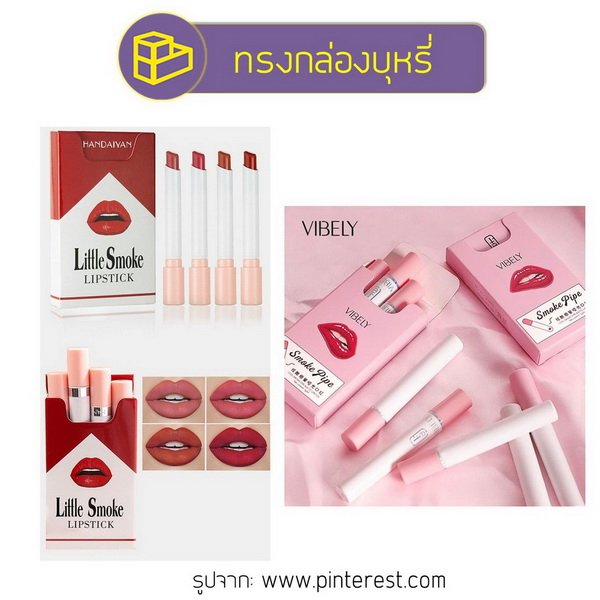 ทรงกล่องบุหรี่ ตัวอย่างกล่องลิปสติกจากแบรนด์ Little Smoke Lipstick สร้างจุดขายโดยการออกแบบให้คล้ายกล่องบุหรี่ โดยการจัดเป็นเซตซึ่งสามารถขายลิปสติกได้หลายแท่งและยังเพิ่มมูลค่าของสินค้าได้ โดยการออกที่สร้างความแตกต่าง มีเอกลักษณ์