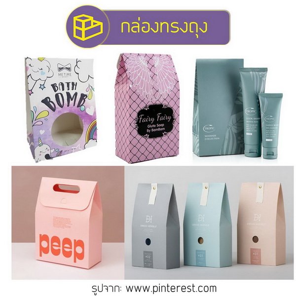 กล่องทรงถุง โดยทั่วไปเรามักจะเห็นทรงกล่องแพคเกจจิ้ง (packaging) นี้ใส่เป็นสินค้าเบเกอรี่ใช่ไหมคะ แต่รู้ไหมว่ากล่องทรงถุงแบบนี้สามารถนำมาใช้เป็นกล่องเครื่องสำอางได้ เช่น กล่องสบู่ กล่องครีม เป็นต้น ซึ่งให้ลุคสไตล์น่ารักๆ เมาะกับแบรนด์ที่ต้องการเจาะกลุ่มวัยรุ่น