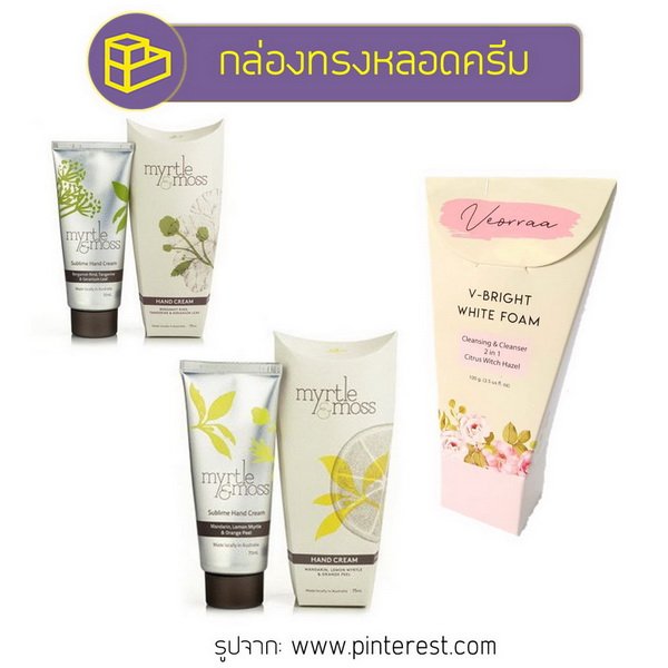 กล่องทรงหลอดครีม เป็นกล่องแพคเกจจิ้ง (packaging) ที่ออกแบบตามรูปทรงของสินค้า โดยลักษณะของหลอดครีมปลายหลอดจะลีบแบน เราจึงออกแบบตามลักษณะนั้น จึงได้เป็นทรงกล่องที่ดูแปลกตา ไม่เหมือนใคร เป็นกล่องครีมที่ดูเก๋ มีสไตล์