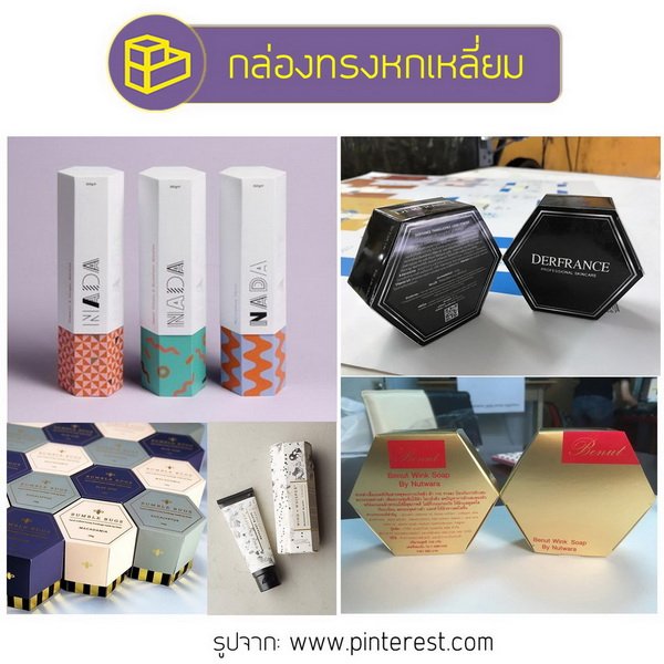 กล่องทรงหกเหลี่ยม กล่องแพคเกจจิ้ง (packaging) ทรงนี้เหมาะกับแบรนด์ที่ต้องการความแปลกใหม่ เรียกความสนใจของลูกค้าได้ดี ด้วยทรงกล่องแพคเกจจิ้ง (packaging) ที่ไม่เหมือนใครและยังสามารถดีไซน์การจัดวางบนชั้นสินค้าได้น่าสนใจอีกด้วย เพราะเมื่อวางกล่องซ้อนกันจะให้นูปลักษณ์เหมือนรังผึ้งนั่นเอง เหมาะกับเครื่องสำอางประเภทครีม เซรั่ม ที่มีบรรจุภัณฑ์เป้นขวดหรือกระปุก