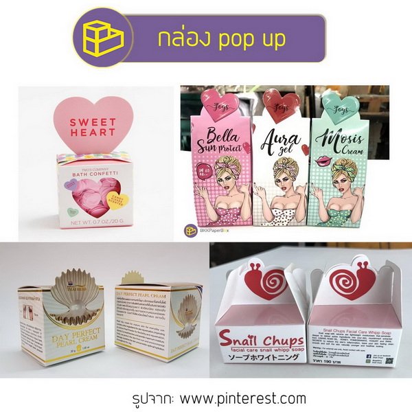 กล่อง pop up เป็นทรงกล่องแพคเกจจิ้ง (packaging) ที่เพิ่มความน่าสนใจโดยการทำตัว pop up เพิ่มขึ้นมาให้ดูโดดเด่น โดยตำแหน่งที่ที pop up จะทำออกแบบเป็นตัวการ์ตูนหรือเป็นข้อความจุดเด่นของสินค้าที่เราต้องการสื่อสารให้ลูกค้าสังเกตเห็นได้ชัด กล่อง pop up จึงเหมาะกับกล่องแพคเกจจิ้ง (packaging) กล่องเครื่องสำอางทุกประเภท ไม่ว่าจะเป็น กล่องครีม กล่องเซรั่ม กล่องสบู่ กล่องลิปสติก กล่องโลชั่น กล่องน้ำหอม เป็นต้น
