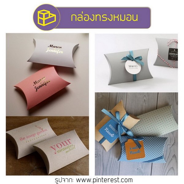 กล่องทรงหมอน ลักษณะกล่องแพคเกจจิ้ง (packaging) จะเป็นการพับเว้าด้านข้างกล่องทั้งสองข้าง มีความนูนป่องตรงกลางกล่องคล้ายหมอน เราจึงเรียกว่า กล่องทรงหมอน เหมาะกับการผลิตเป็นกล่องสบู่ กล่องน้ำหอม เป็นต้น