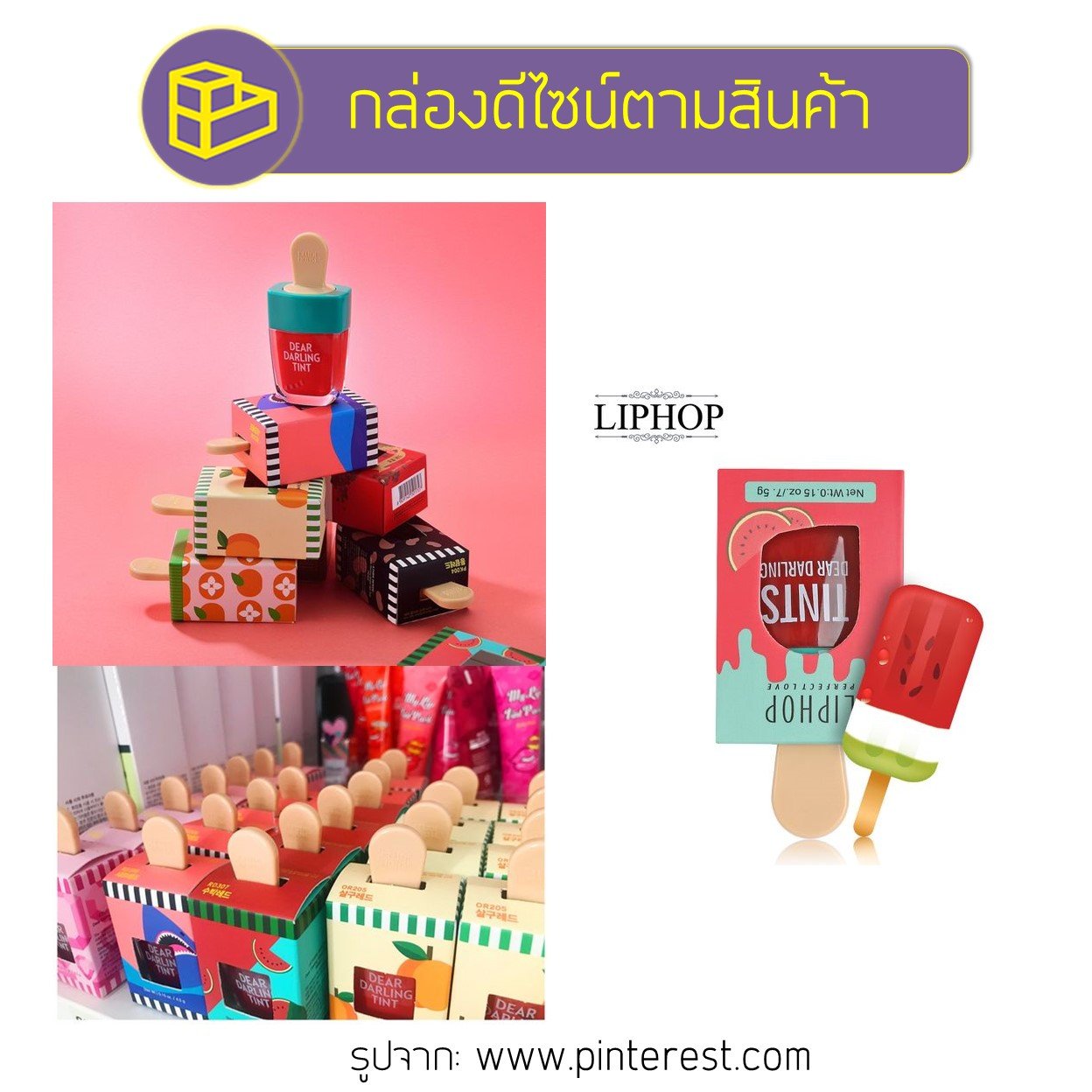 กล่องดีไซน์ตามลักษณะของสินค้า คือ การออกแบบด้วยให้บรรจุภัณฑ์เป็นส่วนหนึ่งของตัวกล่องแพคเกจจิ้ง (packaging) อย่างในตัวอย่างกล่องลิปสติกจากแบรนด์ LIPHOT ที่ตัวแท่งลิปสติกมีลักษณะเหมือนแท่งไอศกรีม จึงนำเอามาผสมผสานกลายเป็นกล่องน่ารักๆ ซึ่งเป็นจุดขายที่ดี