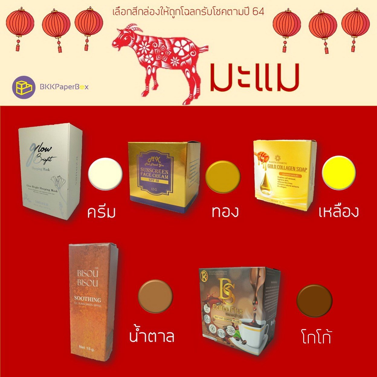 กล่องแพจเกจจิ้ง(packaging) สีมงคลสำหรับคนเกิดปีมะแม (ปีแพะ)