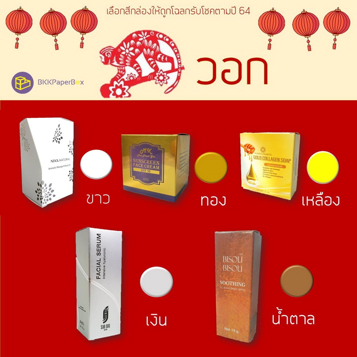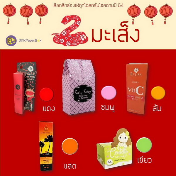BKK PAPER BOX หวังว่าจะเป็นไอเดียให้หลายๆ คนที่กำลังคิดอยู่ว่าจะออกแบบกล่องแพจเกจจิ้ง (packaging) เป็นสีอะไรดี? ...เลือกสีมงคลตามปีเกิดไปเลยก็ได้นะคะ หรือถ้าต้องการคำปรึกษาเรื่องกล่องแพจเกจจิ้ง (packaging) ไม่ว่าจะเป็น กล่องเครื่องสำอาง กล่องผลิตภัณฑ์เสริมอาหาร กล่องสบู่ กล่องเซรั่ม กล่องครีม ฯ ทาง BKK PAPER BOX ยินดีให้คำปรึกษาค่ะ