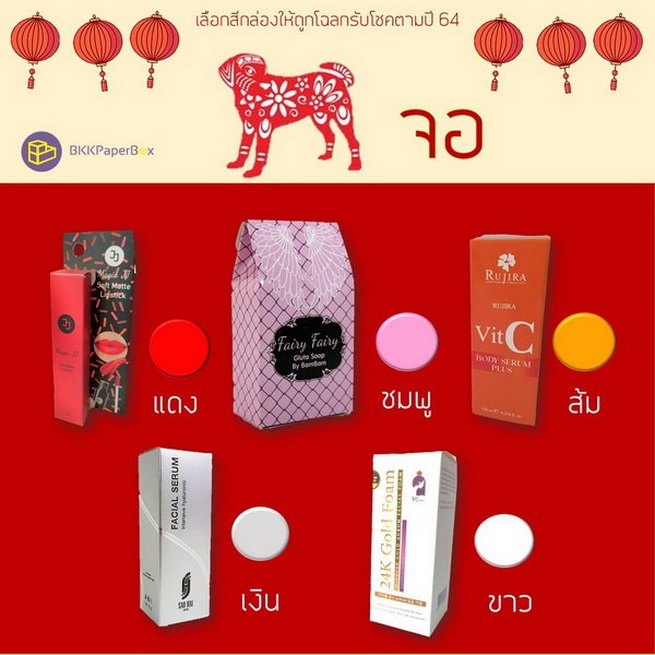 กล่องแพจเกจจิ้ง (packaging) สีมงคลสำหรับคนเกิดปีจอ (ปีสุนัข)