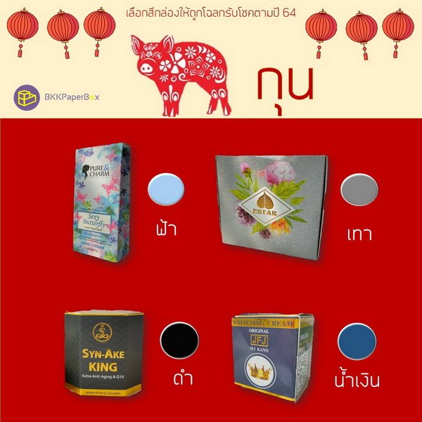 กล่องแพจเกจจิ้ง (packaging) สีมงคลสำหรับคนเกิดปีกุน (ปีหมู)