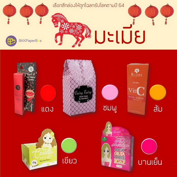 กล่องแพจเกจจิ้ง (packaging) สีมงคลสำหรับคนเกิดปีมะเมีย (ปีม้า)