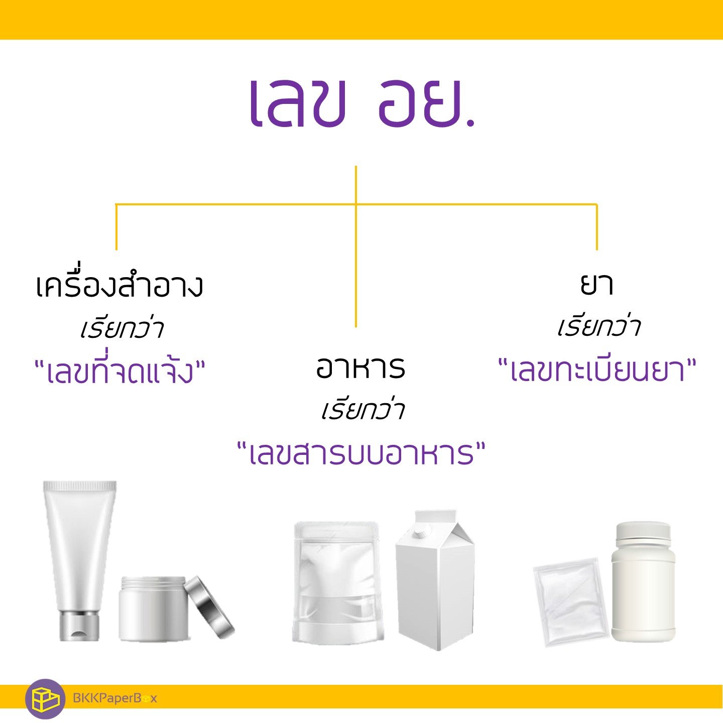 เลข อย. / เลขที่จดแจ้ง เป็นเหมือนเลขประจำตัวของผลิตภัณฑ์ต่างๆ ที่ไปทำการขึ้นทะเบียนจดแจ้งกับทางกระทรวงสาธารณสุข ใครผลิตของกิน ยา เครื่องสำอาง แล้วอยากขาย ก็ต้องไปจดแจ้ง ถ้าเป็นของต่างประเทศก็ต้องมีฉลากไทยพร้อมเลขกำกับทุกชิ้น