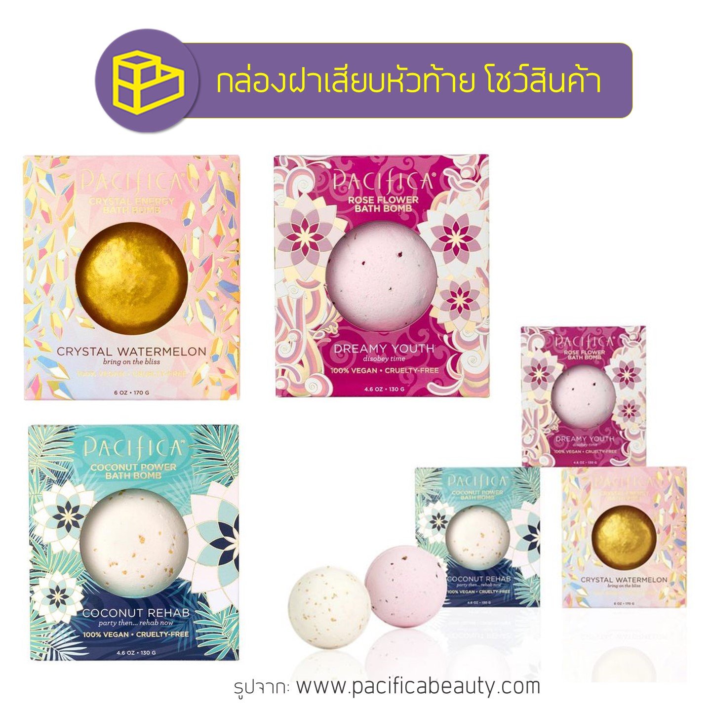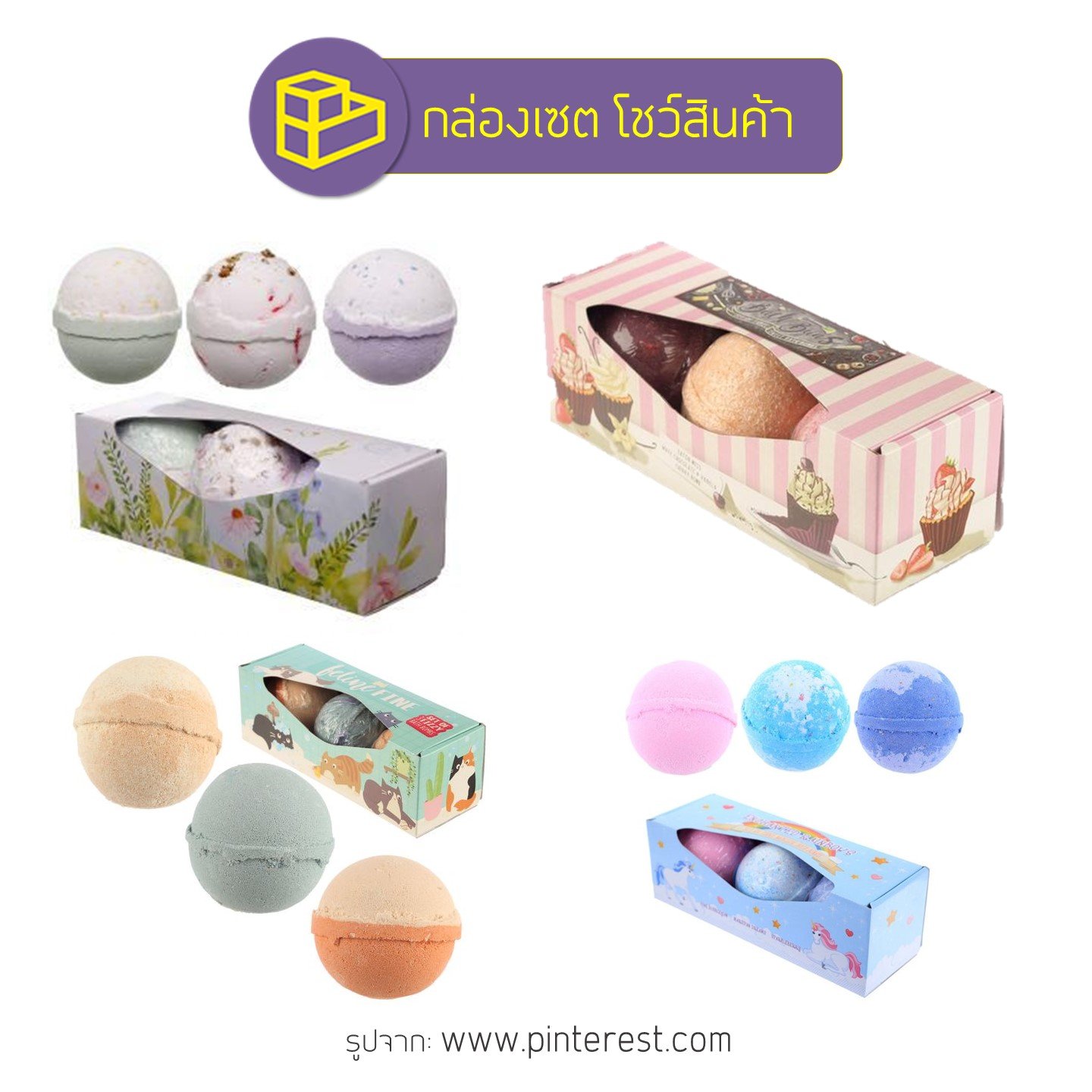 กล่องฝาเสียบหัวท้าย โชว์สินค้า คือ กล่องแพคเกจจิ้ง (packaging) ที่เจาะหน้าต่าง จะปะพลาสติกหรือไม่ก็ได้ แต่แนะนำว่า สินค้าประเภท Scrub & Bath Bombs จะทนความชื้นได้น้อย จึงควรมีพลาสติกหุ้มสินค้าก่อนนำมาใส่กล่อง และปะพลาสติกใสตำแหน่งที่เจาะหน้าต่างด้วย เพื่อป้องกันความชื้นอีกชั้นหนึ่ง