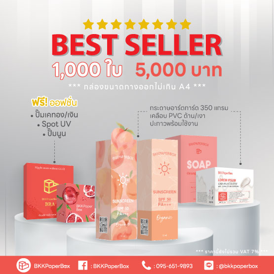 A : จัดโปรฯ นี้ไปเลย Best Seller ผลิต 1,000 ใบ 5,000 บาท แถมฟรีงานออฟชั่นหลังงานพิมพ์ 1 อย่าง เพิ่มความโดดเด่นให้กับกล่องสินค้า