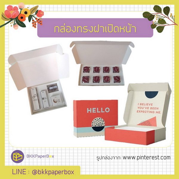 กล่องแพคเกจจิ้ง (Packaging) คล้ายกับทรงฝาครอบค่ะ ต่างกันตรงที่กล่องเปิดฝาหน้า ตัวฝาจะเป็นชิ้นเดียวกับตัวกล่องไปเลย ไม่แยกเป็นฝากับถาดแบบทรงฝาครอบค่ะ BKK PAPER BOX แนะนำให้เพิ่มอินเนอร์ล็อกสินค้าด้านในนะคะ