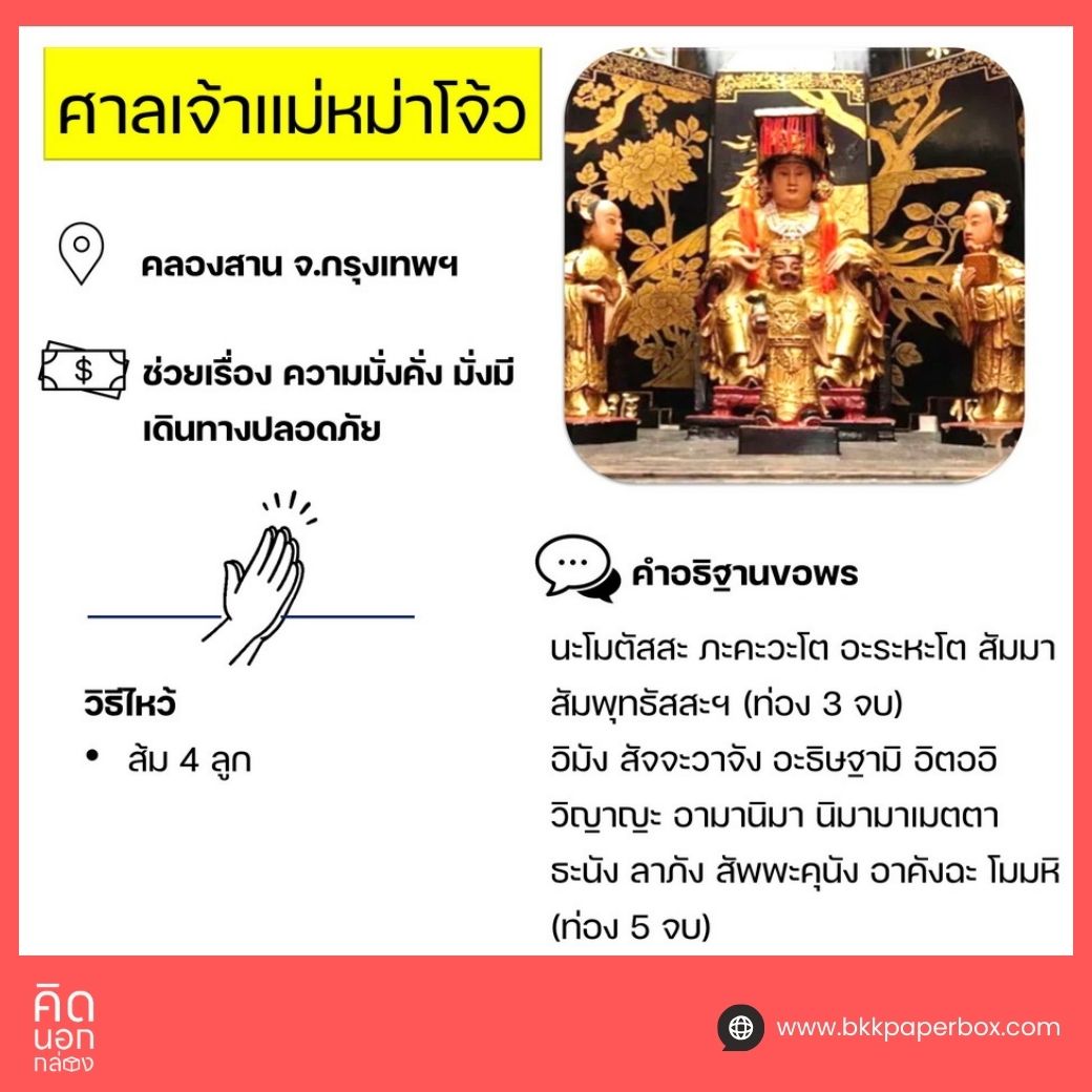 อีกหนึ่งศาลที่มีตำนานกว่า 200 ปี กับศาลเจ้าเก่าแก่ในกรุงเทพฯ ‘ศาลเจ้าแม่หม่าโจ้ว’ ตั้งอยู่ย่านคลองสาน โดยศาลเจ้าแห่งนี้มีเทพประทานคือ เทียนโหวเซียะบ้อ ซึ่งมีความเชื่อว่าท่านสามารถพยากรณ์การเดินเรือค้าขายได้ทั้งลมฟ้าอากาศ ทำให้การเดินเรือราบรื่น ทั้งยังเชื่อว่าช่วยในเรื่องของการค้าขาย ทำให้ร่ำรวยและประสบความสำเร็จ จึงมีผู้คนเดินทางมาไหว้ศาลเจ้าแม่หม่าโจ้วอย่างไม่ขาดสาย นอกจากนี้การมาขอพรจากเจ้าแม่ฯ ไม่จำเป็นต้องบน เพียงแค่ขอพรและจัดของมาไหว้เมื่อสำเร็จ เท่านี้ก็เพียงพอแล้ว