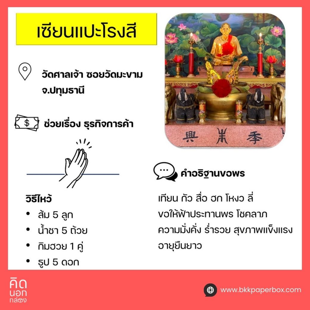 อยากทำธุรกิจร่ำรวย อยากประสบความสำเร็จในหน้าที่การงาน ลองไปไหว้เซียนแปะโรงสีที่วัดศาลเจ้า ซึ่งตั้งอยู่ที่จังหวัดปทุมธานี โดประวัติของเซียนแปะผู้นี้คือท่านเป็นฆราวาสชาวจีนที่ใจบุญ ชอบช่วยเหลือผู้อื่น อีกทั้งยังมีฌาณ สามารถดูฮวงจุ้ยและโหงวเฮ้งได้ โดยในอดีตเชื่อว่าท่าทำให้เกิดปาฏิหารย์กับผู้อื่นหลายครั้ง ทั้งยังมีคนรักและศรัทธาจำนวนมาก หลายคนจึงนิยมมากราบไหว้ขอพรให้เกิดสิ่งดีๆ โดยเฉพาะเรื่องการงาน ธุรกิจ
