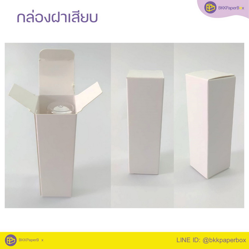 ลักษณะเด่น : เป็นกล่องทรงสี่เหลี่ยม มีฝาเสียบหัวและท้าย เป็นกล่องที่มีโครงสร้างง่าย ทำเป็นแพทเทิร์นขนาดเล็กหรือใหญ่ สูงหรือเตี้ยก็ได้ เพราะปรับขนาดตามสินค้าได้เลย จุดเด่นของกล่องฝาเสียบ คือ ราคาผลิตถูกกว่ากล่องทรงอื่นๆ ด้วยเหตุผลว่า โครงสร้างกล่องไม่ซับซ้อนและใช้เครื่องผลิตปะกาวข้างกล่องได้ เรียกได้ว่าใช้เครื่องจักรจบงานได้ทุกขั้นตอน ลดเวลา ลดแรงคน ดังนั้น กล่องทรงฝาเสียบจึงเหมาะกับแบรนด์ที่ต้องการกล่องสวยและราคาถูก กล่องทรงนี้จึงเหมาะกับสินค้าทุกประเภท เช่น ยาดม น้ำหอม น้ำมันหอมระเหย สบู่ ลิปสติก ขวดเซรั่ม ขวดครีม กระปุกครีม มาสคาร่า เป็นต้น