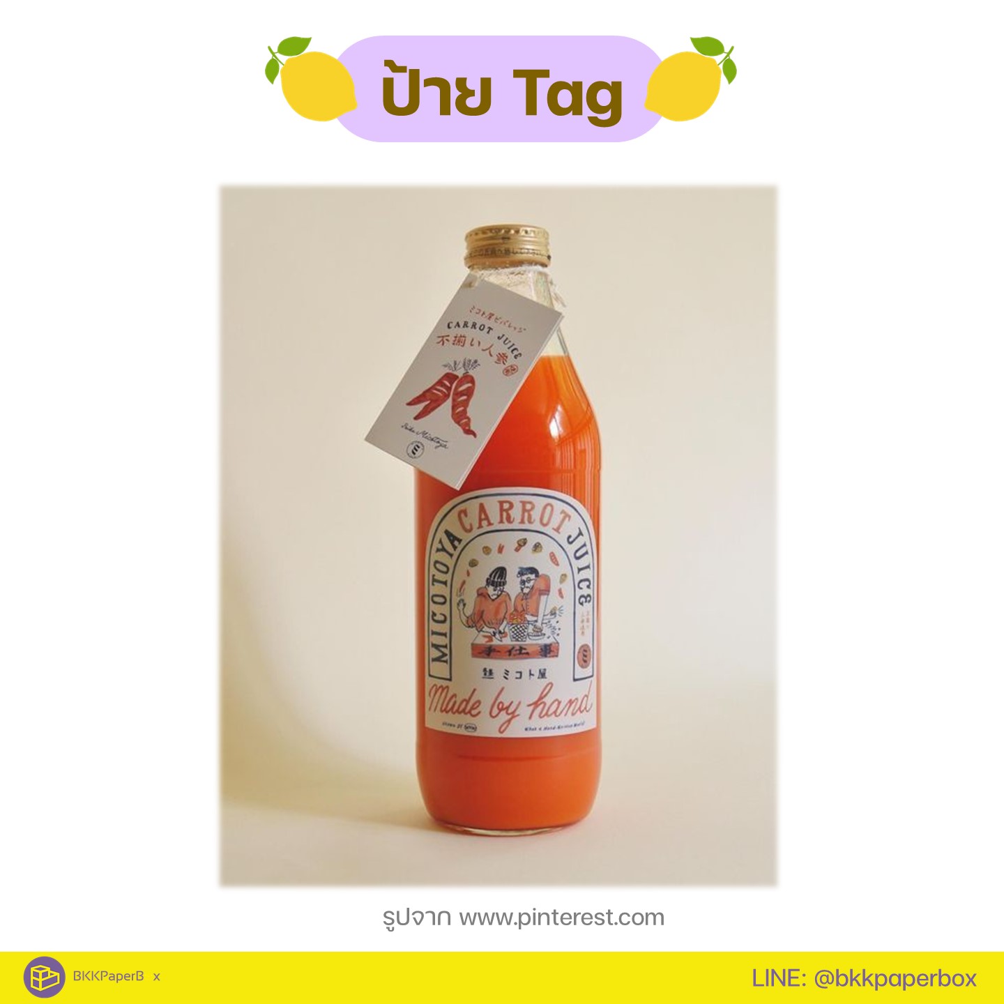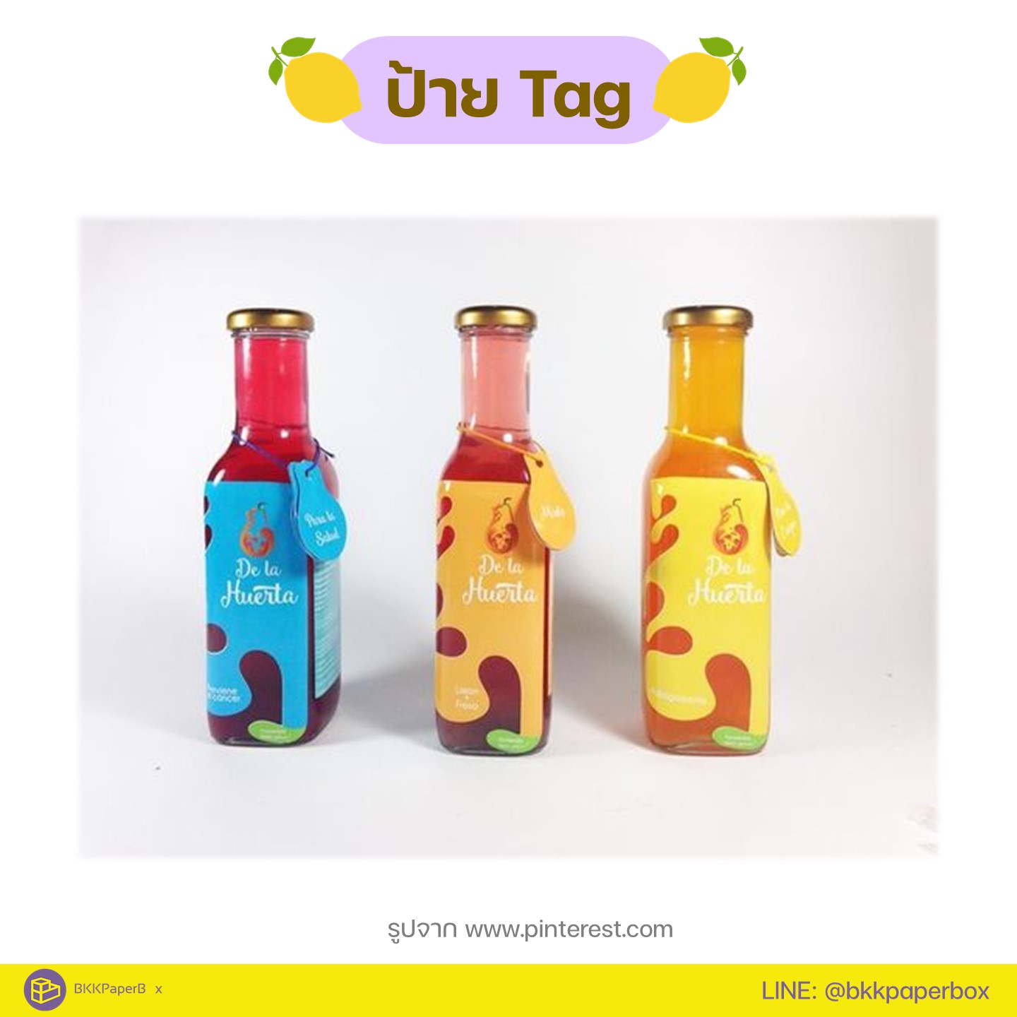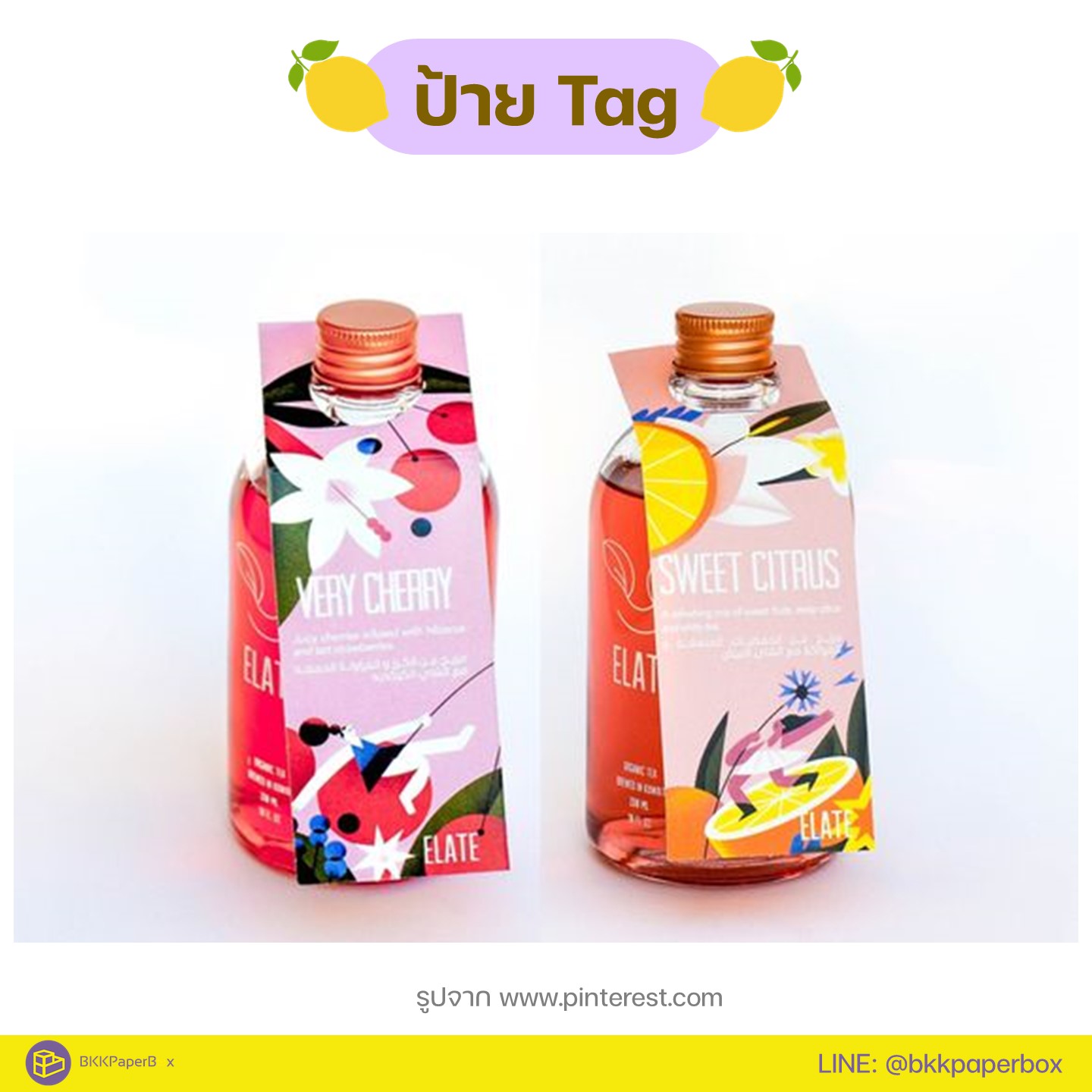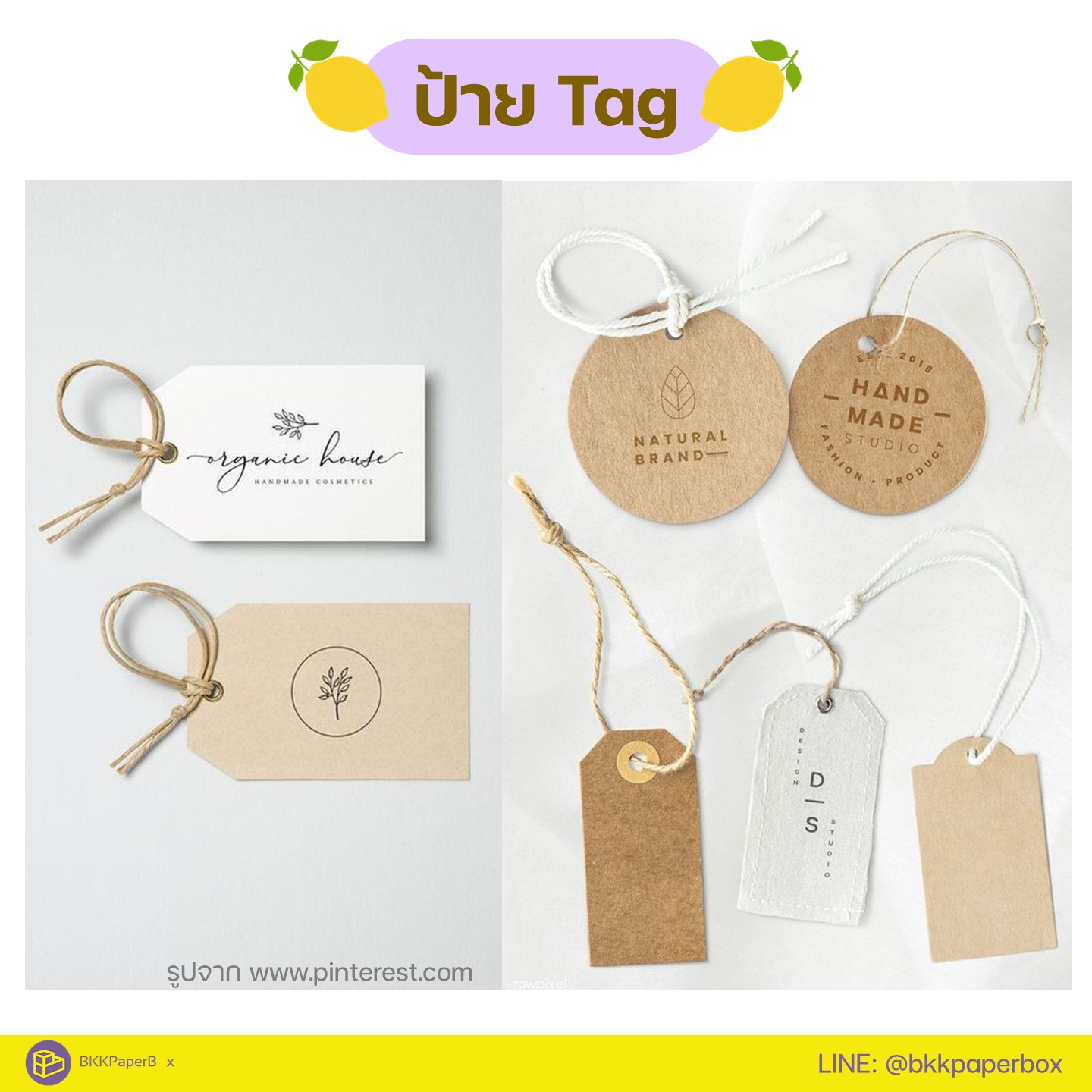 ลักษณะเป็นป้ายกระดาษรูปทรงต่างๆ เจาะรูมีเชือกผูกสำหรับคล้อยที่คอขวด ถือเป็นออฟชั่นเสริมที่เรียกความประทับใจให้กับลูกค้าได้ค่ะ ในป้ายแท็กนี้สามารถใส่ข้อมูลสินค้าสั้น ๆ ได้ หรือใส่เป็นช่องทางการติดต่อก็ได้ค่ะ เป็นองค์ประกอบที่ช่วยสร้างให้เกิดความน่าสนใจของแบรนด์มากขึ้น