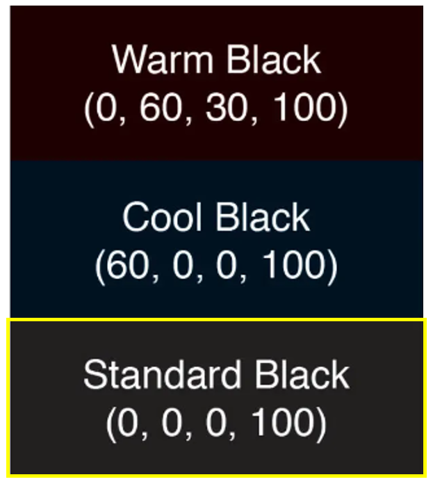 ตัวอย่าง การตั้งค่าสีดำ ที่มีค่าสี CMYK แตกต่างกัน ถ้ามองภาพด้านล่างนี้ ผ่านจอภาพทั่วไปจะเห็นเป็นสีดำเหมือนกัน