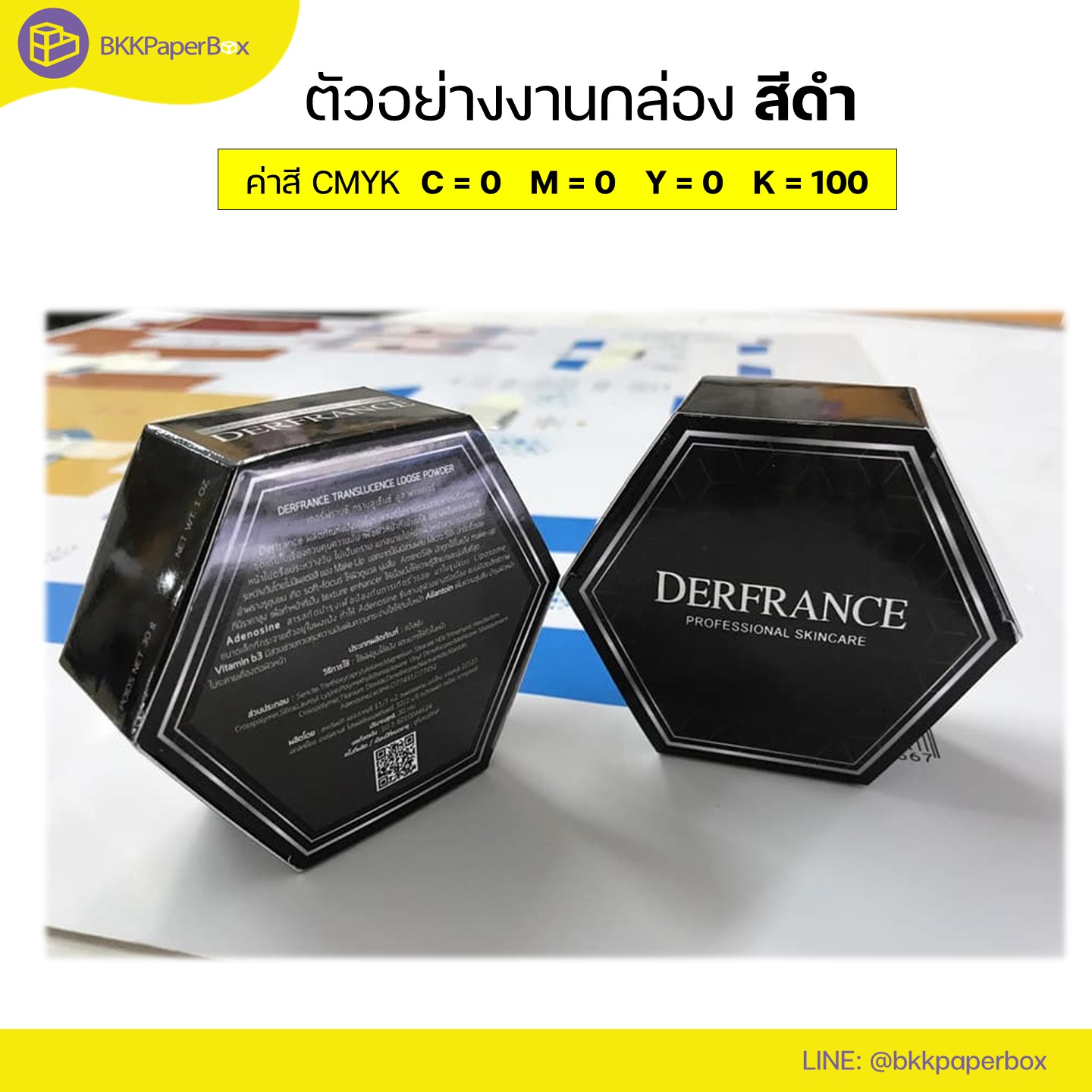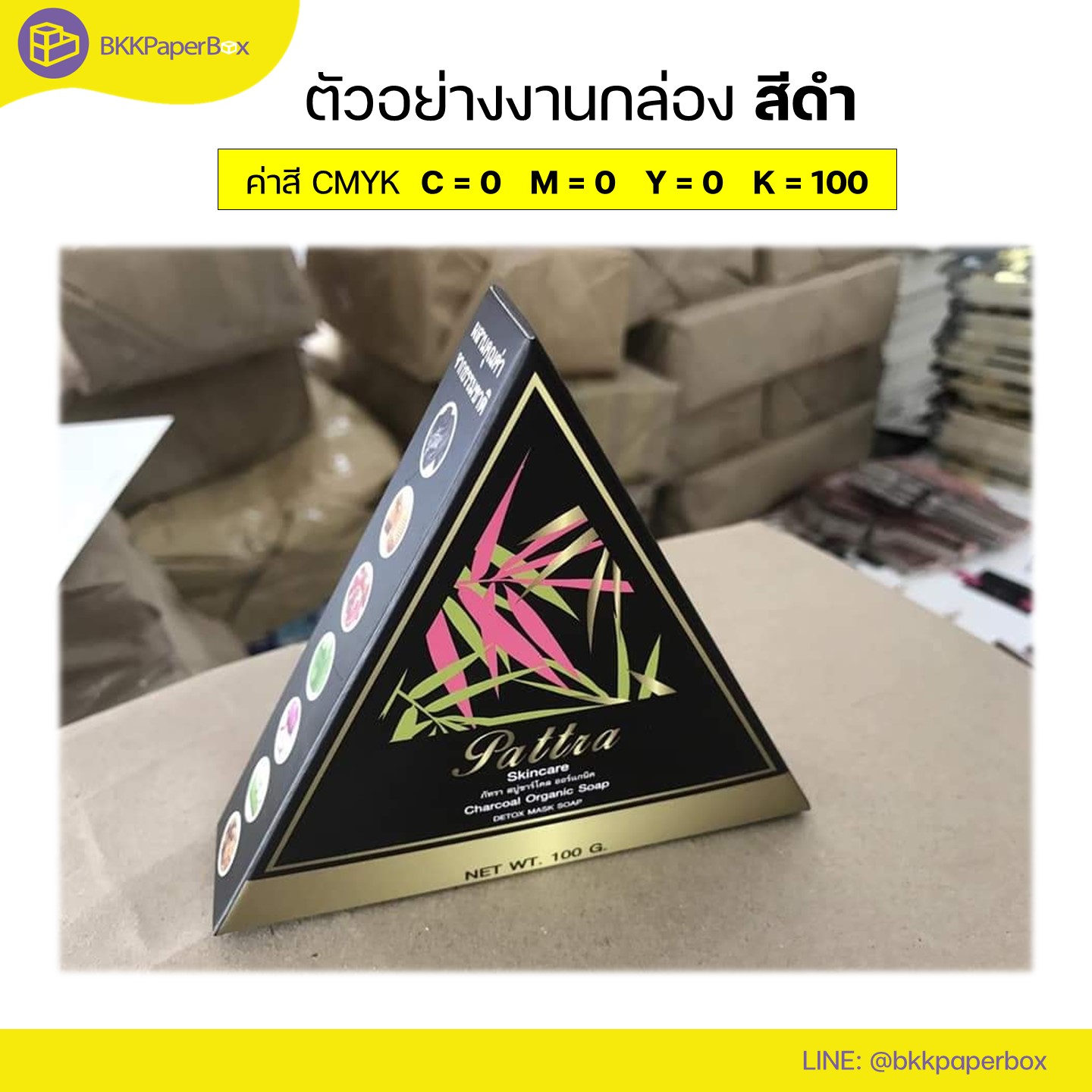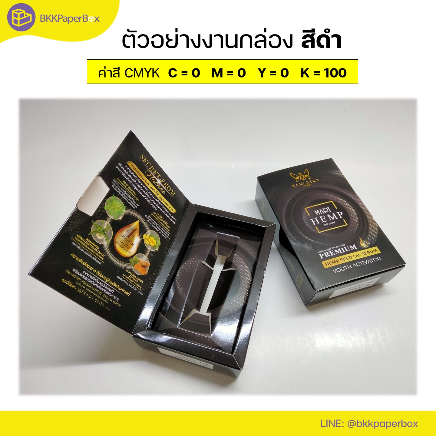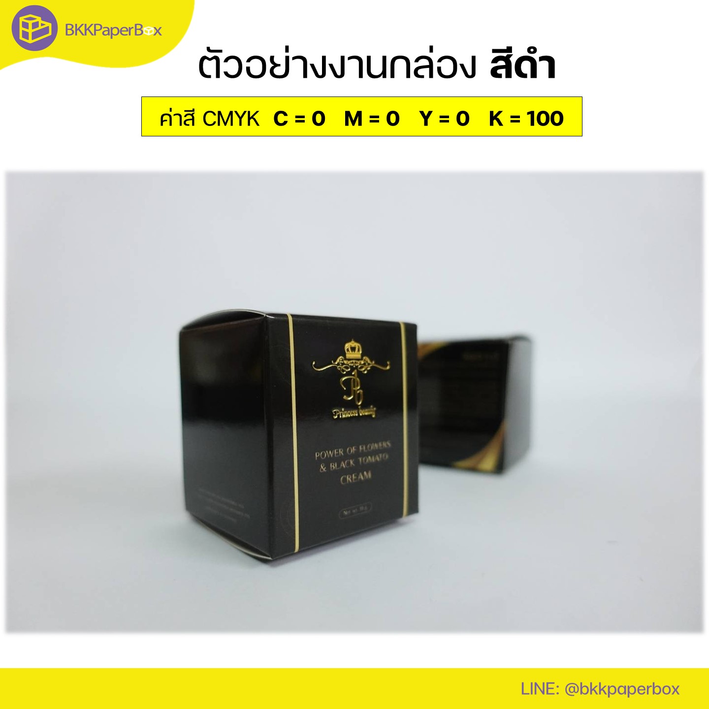 ในงานออกแบบและผลิตกล่อง BKKPaperBox จะมีเทคนิกการตั้งค่าสีในงานออกแบบด้วยค่าสี CMYK โดยเฉพาะ เพื่อให้ได้สีดำ แบบดำเดียว แบบดำที่ถูกต้อง ให้กับลูกค้า แต่...บางครั้งที่ลูกค้าส่งไฟล์งานมาให้โรงงานผลิต ค่าสี CMYK ที่ใช้มักจะมีการตั้งค่าที่ต่างออกไป ซึ่งในงานออกแบบถ้ามองด้วยตาก็ดูเป็นสีดำ แต่เมื่อพิมพ์งานกล่องจริงออกมาแล้วกลายเป็นสีดำติดแดงหรือดำติดเขียว เป็นต้น