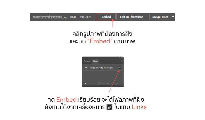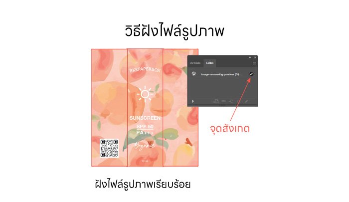 ลิงก์รูป เป็นการฝังรูปภาพลงในไฟล์งานอาร์ตเวิร์ค (Artwork) โดยต้องทำทุกครั้งก่อนส่งโรงงานผลิตกล่อง เพื่อไม่ให้รูปที่เราใช้ในงานออกแบบนั้นสูญหายไปในระหว่างกระบวนการส่งไฟล์งานให้กับโรงงานผลิตนั่นเอง