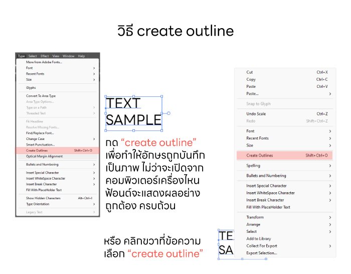 ตรงข้อความจะไม่สามารถอ่านได้ สาเหตุที่เป็นเช่นนี้ ส่วนหนึ่งจะเกิดจากเครื่องที่ได้รับไฟล์นั้นไม่มีฟอนต์ที่เราใช้ ดังนั้น การครีเอทฟอนต์ จะช่วยให้ไฟล์งานของเราเปิดได้ทุกเครื่อง และใช้ผลิตงานได้ทุกที่