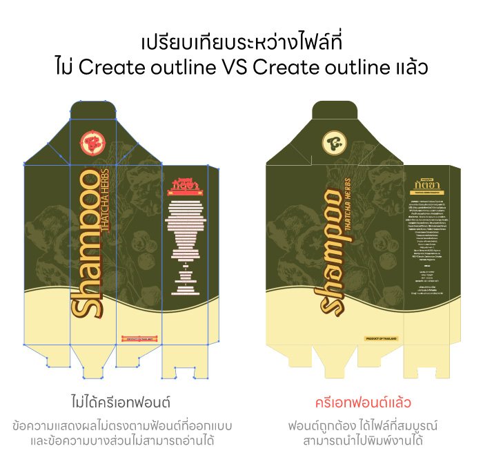 การครีเอทฟอนต์และใส่ลิงก์รูปให้เรียบร้อยก่อนส่งให้โรงงานผลิตกล่อง เป็นเหมือนการขีดเส้นใต้จบงานออกแบบให้เรียบร้อย เพื่อให้ได้ไฟล์งานที่สมบูรณ์แบบที่สุด และได้งานผลิตตามที่ออกแบบไว้