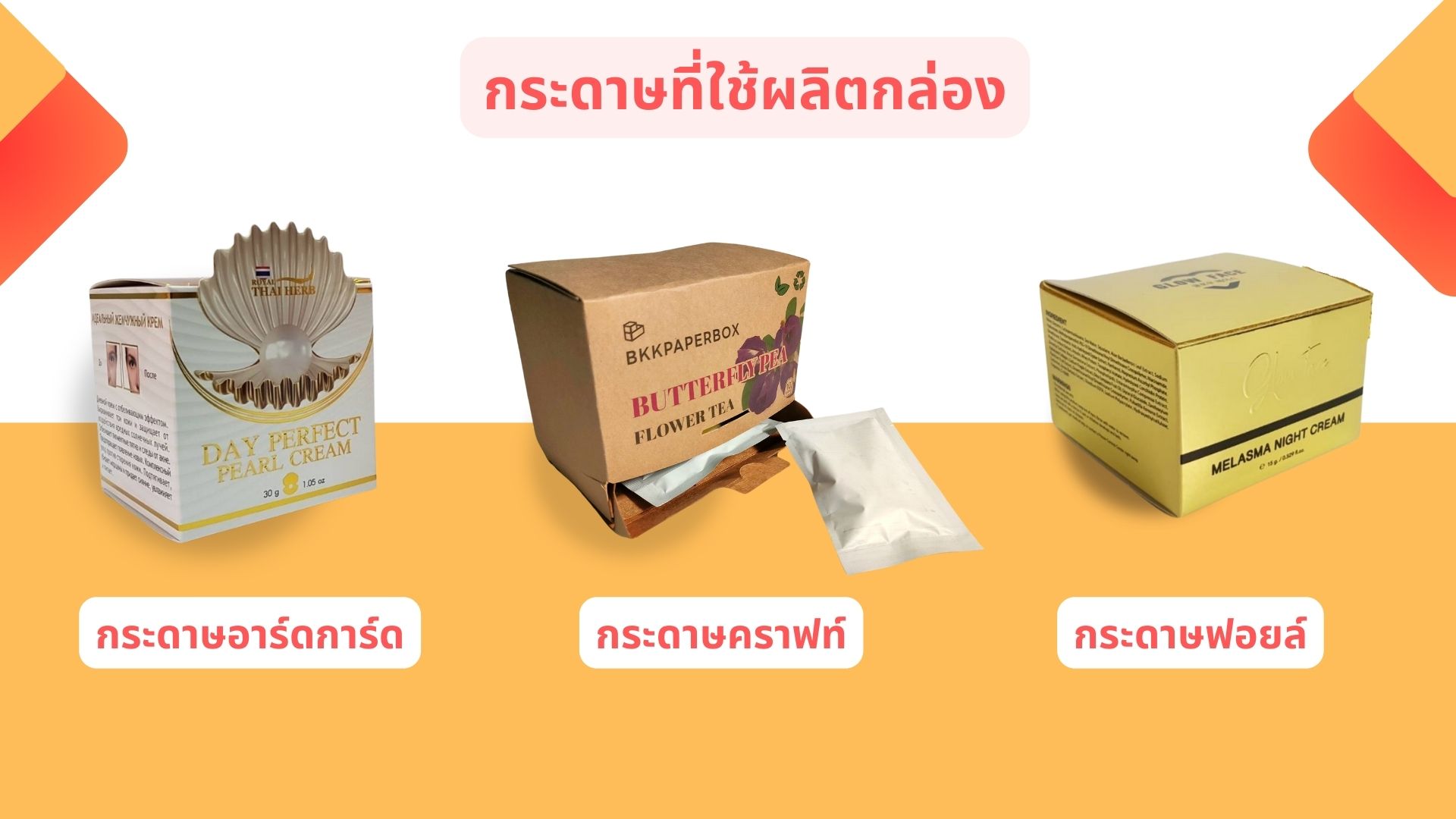 ประเภทของกระดาษมีผลต่อราคากล่อง เพราะกระดาษแต่ละชนิดมีคุณสมบัติต่างกัน ในเรื่องของเส้นใยในเนื้อกระดาษ ขั้นตอนการผลิตกระดาษ (บางชนิดต้องเคลือบ บางชนิดต้องฟอกสี) ความเรียบและความขาว รวมไปถึงความหนาและความแข็งแรงของตัวกระดาษด้วย กระดาษที่นิยมใช้ผลิตกล่องบรรจุภัณฑ์ ได้แก่