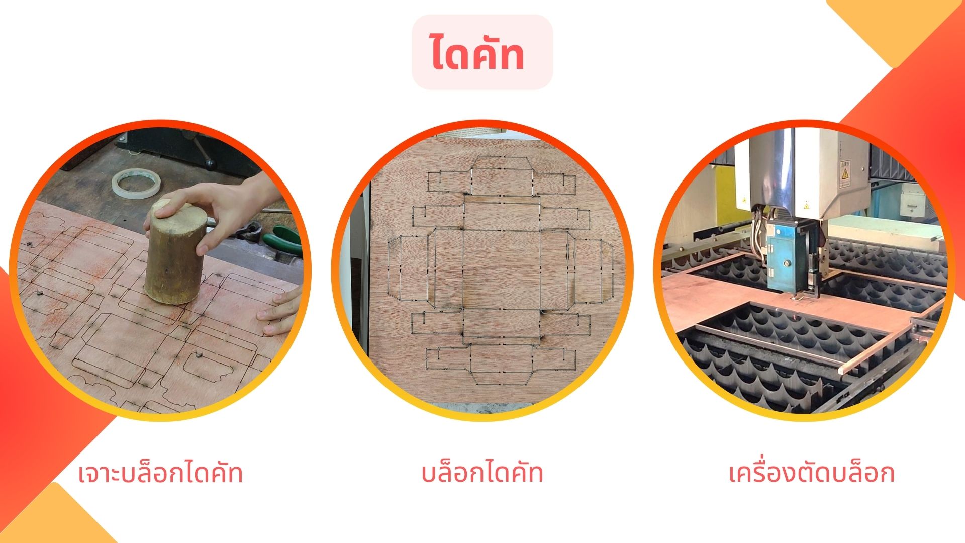 คือ การตัดแผ่นงานพิมพ์ให้เป็นรูปทรงต่างๆ ตามแพทเทิร์นกล่องหรืองานดีไซน์ที่ทางกราฟฟิกได้ออกแบบไว้ แล้วทำ "บล็อกไดคัท" โดยใช้ใบมีดดัดเป็นโครงร่างตามแบบที่กำหนด ซึ่งถ้ากล่องมีโครงสร้างที่ซับซ้อน มีรอยพับหรือมีส่วนเว้าส่วนโค้งมากๆ ก็จะทำให้งานทำบล็อกไดคัทมีความละเอียด ใช้เวลา และใช้จำนวนใบมีดมากขึ้น จึงทำให้ค่าผลิตอาจเพิ่มขึ้นตามไปด้วย