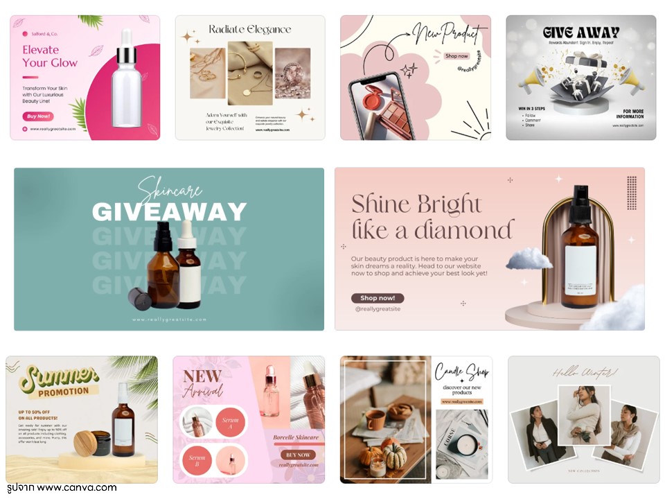 Template สำเร็จรูปที่มีมากถึง 60,000 แบบ ให้ใช้งานได้ฟรี สามารถเลือกนำมาเป็นไอเดียต่อยอดกับงานที่ทำได้ โดยกำหนดสไตล์ตามความต้องการได้ เช่น Modern, Minimal} Elegant และอื่นๆ อีกหลายสไตล์ให้เลือก รวมทั้งกำหนด Theme ให้สอดคล้องกับแบรนด์สินค้าได้ เช่น Beauty, Fashion, Business เป็นต้น