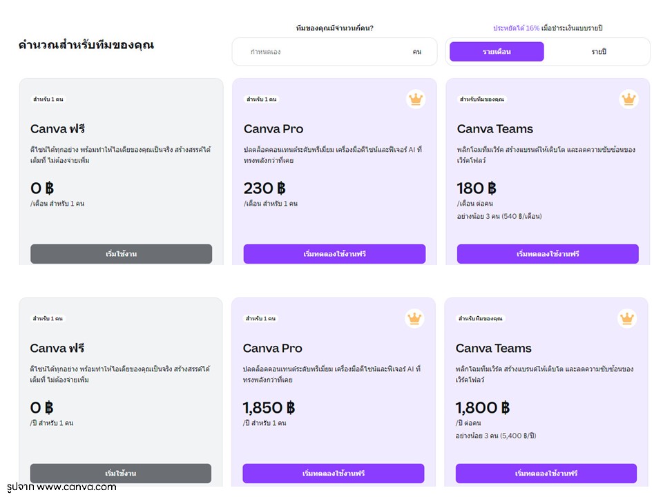 ส่วนราคาของ Canva จะขึ้นอยู่กับจำนวนสมาชิกในการใช้งาน โดยเริ่มต้นทดลอง Canva Pro จะมีการเปิดให้ใช้งานฟรี ถึง 30 วัน เพื่อเป็นช่วงการทดลองใช้ ซึ่งหากคุณต้องการใช้เกิน 30 วัน คุณสามารถเลือกได้ว่าต้องการให้เรียกเก็บเงินในรูปแบบรายเดือนหรือรายปี โดยราคาของ Canva นั้นจะเรียกเก็บจากจำนวนสมาชิกที่ต้องการใช้งาน ซึ่งสามารถเลือกได้ถึง 5 ระดับ ตั้งแต่ 1 คน , 5 คน , 10 คน , 15 คน ไปจนถึงการกำหนดจำนวนสมาชิกในการใช้งานได้เอง