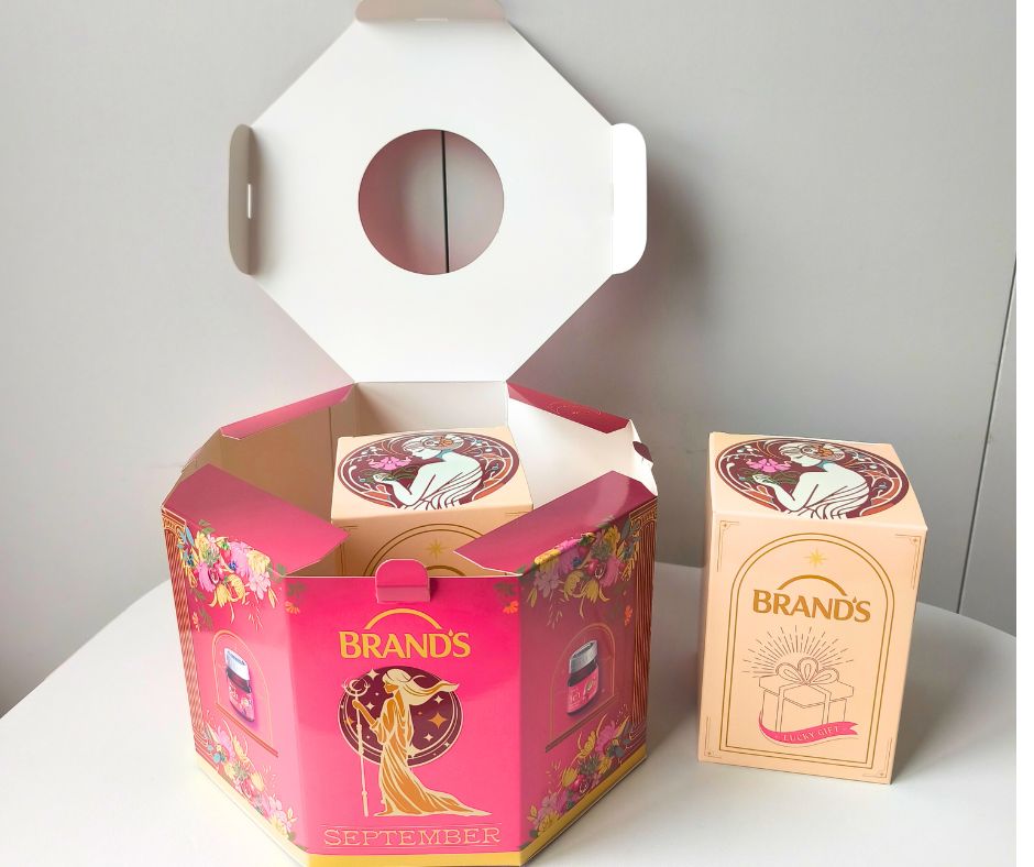 นอกจากนี้ BRAND’S วีต้า ยังได้ให้ความสำคัญกับการออกแบบตัวบรรจุภัณฑ์เป็นกล่องกระดาษอาร์ดการ์ด 350 แกรม ที่มีความหนามาตรฐานรองรับนำหนักสินค้าได้ ช่วยปกป้องไม่ให้สินค้าด้านในเสียหายก่อนถึงมือลูกค้า อีกทั้งมีการออกแบบเป็นกล่องทรงแปดเหลี่ยม มีไอเดียมาจากกระจกแปดเหลี่ยมของคนจีน ที่มีความเชื่อว่าจะช่วยปัดเป่าสิ่งไม่ดี นำพาแต่ความสุขสงบมาให้เจ้าของ ส่วนลวดลายบนกล่องได้ล้อไปตามแต่ละราศี เช่น ราศีกันย์จะออกแบบลดวลาย ใส่สัญลักษณ์ และคำพยากรของราศีกันย์ พร้อมกับวางขายในเดือนกันยายน ที่เป็นเดือนของชาวราศีกันย์นั้นเอง